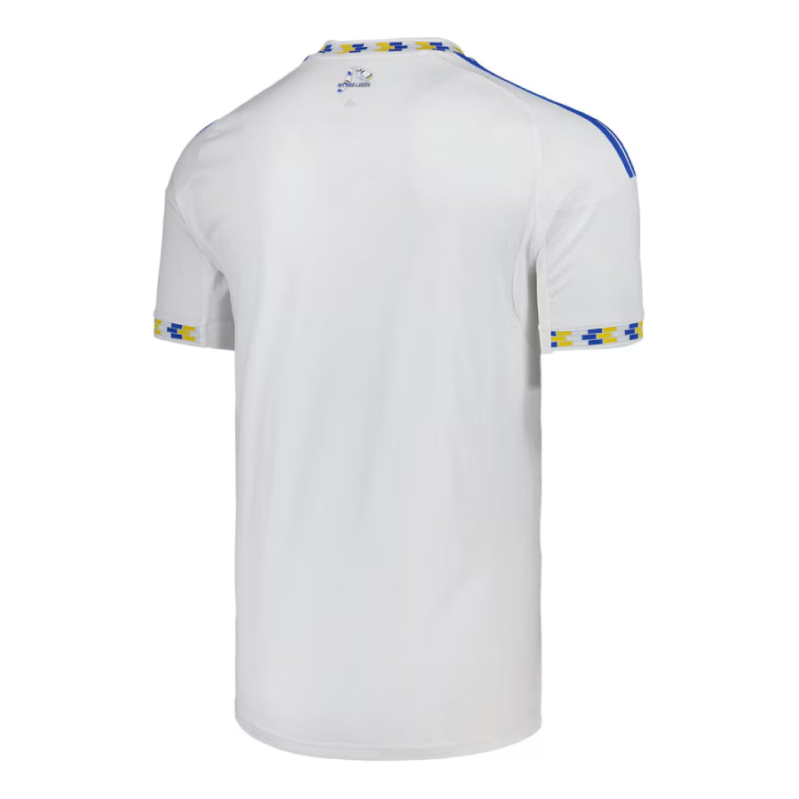 Celebrate the Whites’ Premier League return with the Leeds United Adidas men’s home football jersey for 2025/26. This iconic white kit, inspired by the vibrant Lowfields Tunnel at Elland Road, features blue Adidas stripes on the shoulders and a unique yellow-and-blue tile pattern on the collar and cuffs.